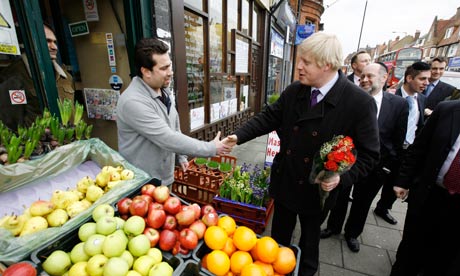 London Mayor Boris Johnson shakes hands with a shopkeeper while canvassing in Golders Green for the launch of his 2008 campaign. Help us track this year's candidates' campaigns by submitting reports on their activity. Photograph: Martin Argles for the Guardian